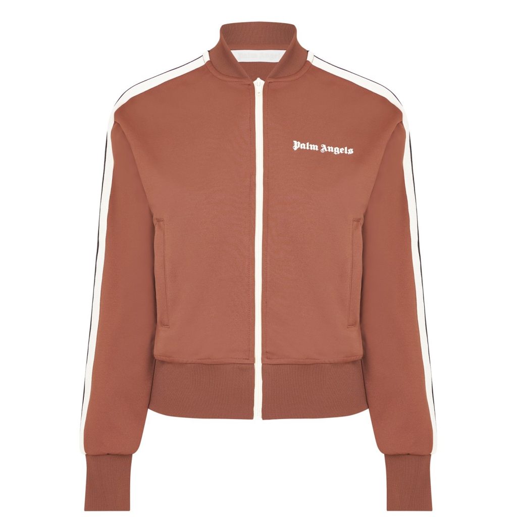Made from a technical polyester jersey, this track jacket is cut in a regular fit and features a stand collar with a central zip closure, long sleeves, two side slit pockets, a straight hemline and ribbed trims to the sleeves and hem for a comfortable wear. The look is finished with striped tape detailing down each sleeve and the Palm Angels logo printed to the chest for brand recognition. Machine washable at 30 degrees.